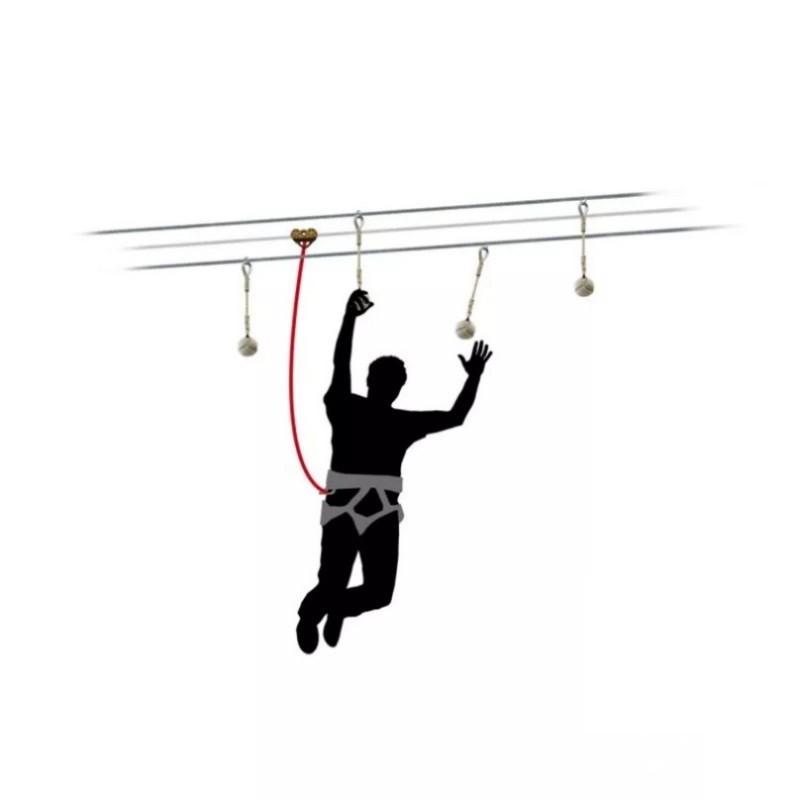 它由直径150毫米的聚丙烯球体组成,由纹理聚丙烯制成。为了将其固定在顶绳上,每个球都配备了一个16毫米的吊挂,顶部带有带有凸起环和环。该模块总长80厘米,高度经过调整,方便所有人从起始平台上接住。