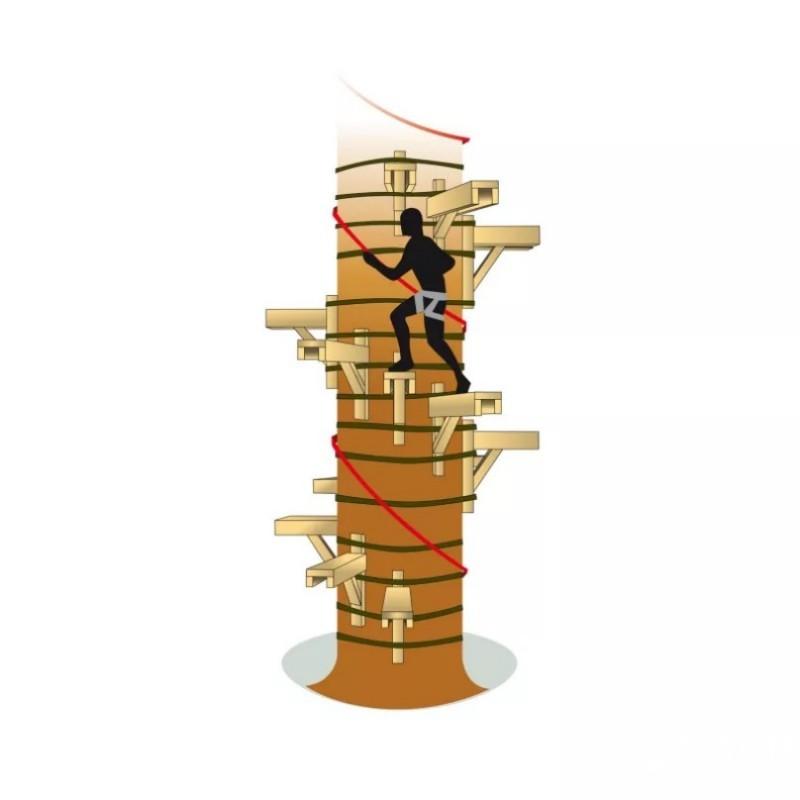 这个游戏模块用棘轮绑带将楼梯固定在树上。