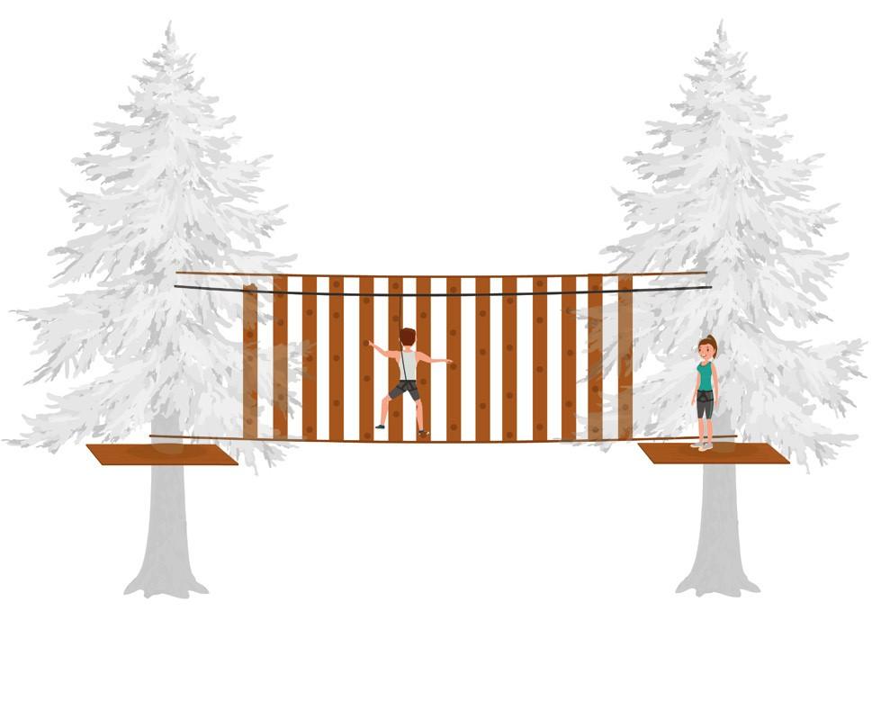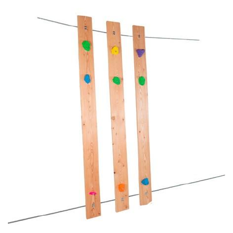 安装在两根钢丝绳上。钢丝绳之间的距离可定制。由落叶松木材制成的。板尺寸:20厘米× 250厘米。攀爬支架数量:每块板上3个。颜色攀爬架颜色: