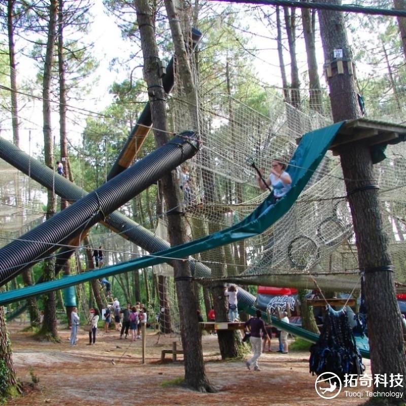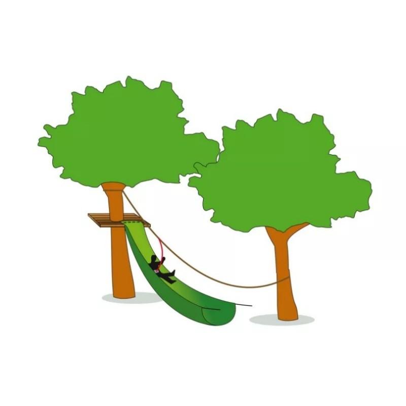 The slide is made of polyester canvas with a PVC coating with a density of 900 g/m2. The tarpaulin has a sheath on the lengths for the passage of the cable. A hem with eyelet is provided at the top to allow the toboggan to be attached to the platform.