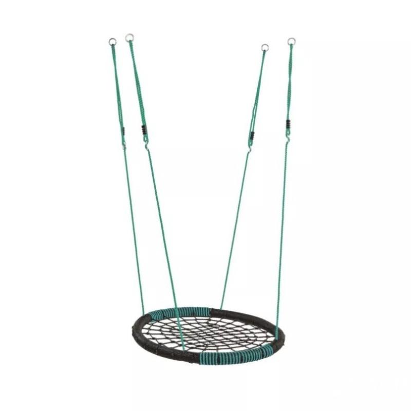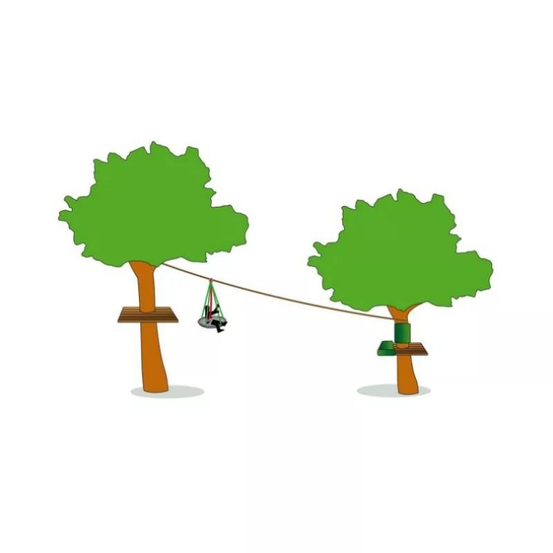 This zip line is made with a swing with a soft impact zone and a black polypropylene overmoulding. The suspension rings and the eight galvanized steel adjustment rings are supplied. The Basket is oval in shape and is 1 m long and 0.80 m wide. The module is bi-coloured: green/black. The ropes are easily adjustable.